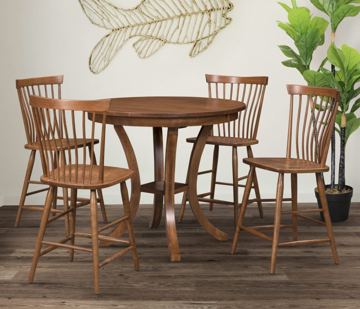 The American Relaxation Table Set is a perfect blend of timeless tradition and modern style. This table set pays homage to the classic early American design, featuring updated spindle Windsor chairs and a versatile round-to-oval top with expandable extensions. The American Relaxation Collection brings together the best of both worlds, offering a touch of nostalgia with a fresh twist.