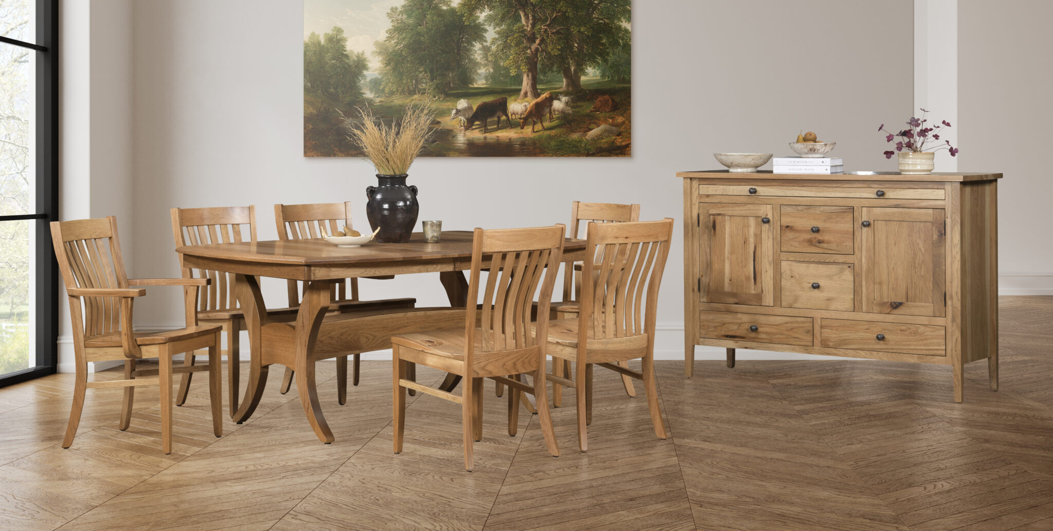 The Hidden Treasure Dining Chairs combine elegantly curved slats, solid wood construction, and handcrafted Amish quality for lasting comfort and style.